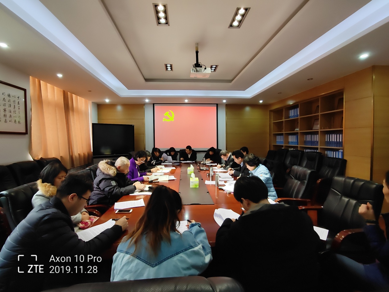 11月28日上午,云顶娱乐 党支部召开“不忘初心、牢记使命”主题教育再深入学习活动。党支部副书记赵华荣同志主持会议,组织大家学习了《关于做好“不忘初心、牢记使命”主题教育有关工作的通知》、《中国共产党第十九届中央委员会第四次全体会议文件汇编》以及《中共中央关于坚持和完善中国特色社会主义制度、推进国家治理体系和治理能力现代化若干重大问题的决定》等文件。