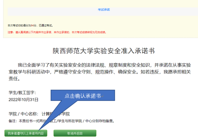 3. 提交后,当成绩大于等于90分,会出现下图提示,点击“我承诺遵守以上承诺书内容“,整个考试结束。