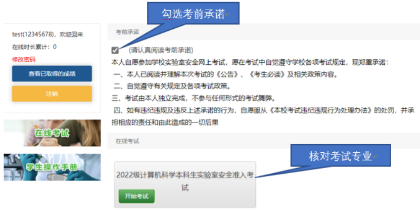 1. 登录成功进入考试,首先勾选考前承诺,其次核对自己参加考试的专业,然后点击“开始考试“;