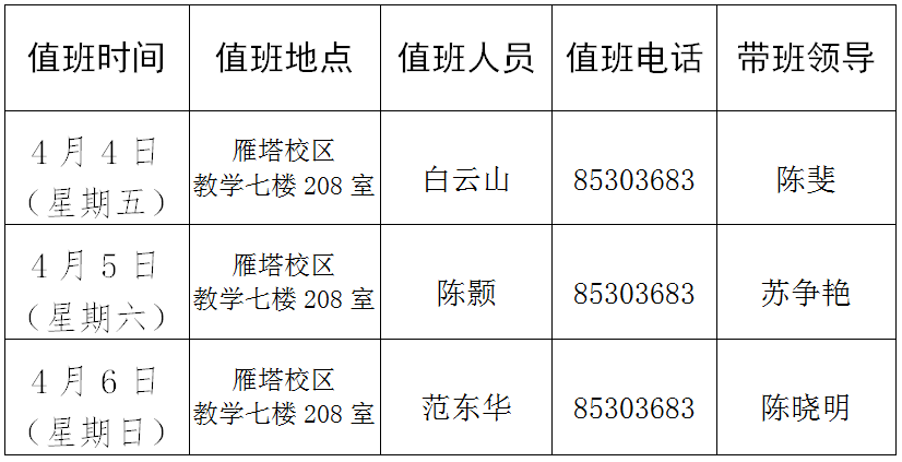 2.值班期间如遇有紧急、重要事项或突发事件,应立即联系带班领导并向学校总值班室(校务楼110室,85310005)报告并妥善处置;