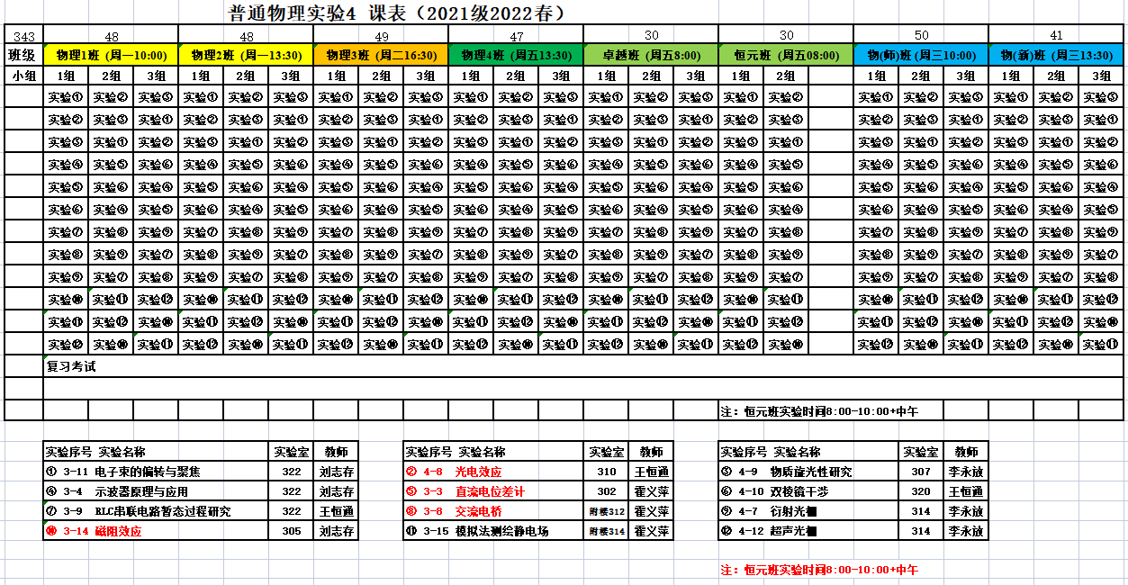 2022春-普通物理实验4课表