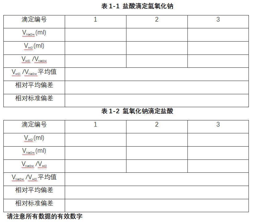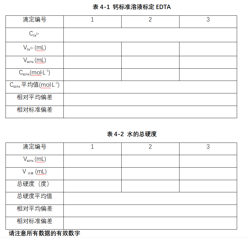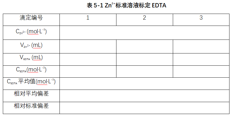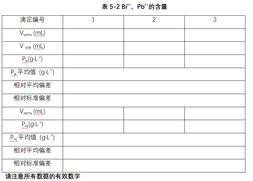 写出有关公式,将实验数据和计算结果填入表5-1和5-2。根据V1、V2及相关数据计算Zn2+标准溶液浓度、EDTA标准溶液浓度、待测试液中Bi3+、Pb2+的含量(以质量浓度P/g·L-1表示),并计算三次测定结果的相对标准偏差。对标定结果要求相对标准偏差小于0.2%,对测定结果要求相对标准偏差小于0.3%。