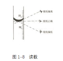 (3)无色和浅色溶液将有清晰的凹液面,读数时应保持视线与凹液面的最低点相切。视线偏高(俯视)将使读数偏小,视线偏低(仰视)将使读数偏大。颜色较深的溶液(如KMn04、I2等)无法清晰辨认凹液面,读数时,应读取溶液上沿(图1-8)。