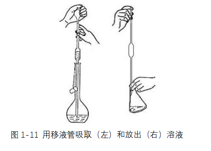 移液管和吸量管都是可以准确移取一定体积溶液的量器,但是两者从外观上有差别,移液管是一根中部膨大的细长玻璃管,上有一环形标线,只能移取一个准确体积的溶液;吸量管是具有分刻度线的玻璃管,可准确移取小于最大体积的不同体积溶液。使用移液管和吸量管时,一般用右手拿移液管(吸量管),左手拿洗耳球。右手大拇指和中指拿住移液管(吸量管)刻线以上处,食指在管口上方(注意这里坚决不能使用大拇指),随时准备按住管口,另外两指辅助拿住移液管(吸量管)(图1-11)。