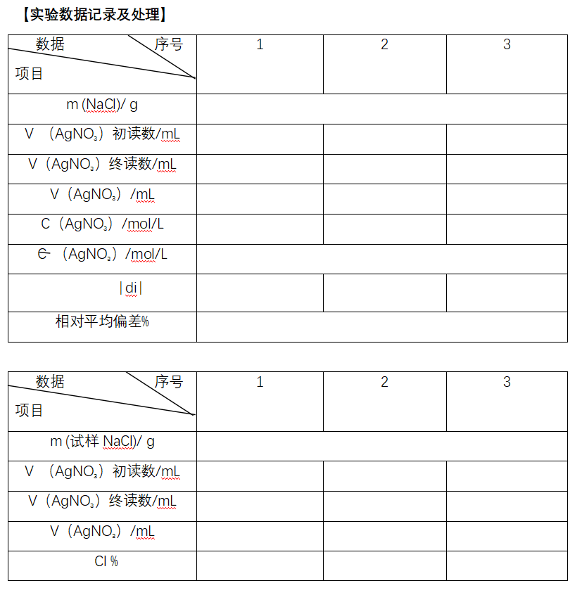 试剂:NaCl基准试剂:使用前在500~600℃灼烧30 min,置于干燥器中冷却。AgNO3化学纯。K2CrO4溶液5%。NaCl试样:粗食盐。AgNO3溶液。