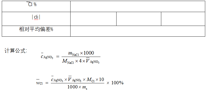 准确移取25.00 mL NaCl试液于250 mL锥形瓶中,加水25 mL,5% K2CrO4 1mL断摇动下,在不断摇动下,用AgNO3标准溶液滴定至溶液出现砖红色沉淀,即为终点。平行测定3份,计算试样中氯含量。
