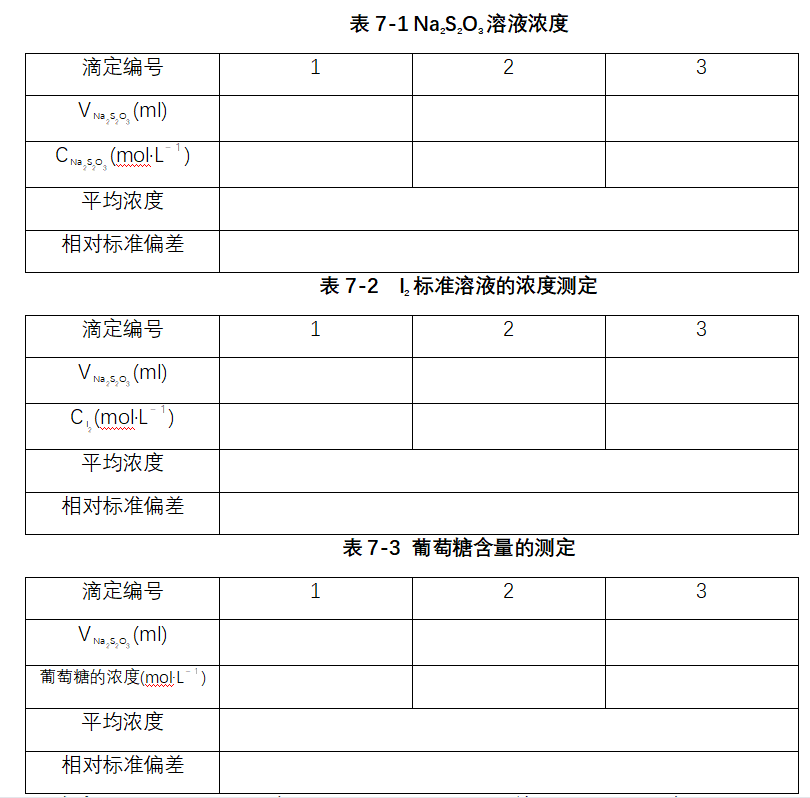 写出有关公式,将实验数据和计算结果填入表7-1、7-2和7-3。根据滴定所消耗的体积分别计算Na2S2O3溶液、I2标准溶液的浓度和葡萄糖含量,并计算三次测定结果的相对标准偏差。对标定结果要求相对标准偏差小于0.2%,对测定结果要求相对标准偏差小于0.3%。