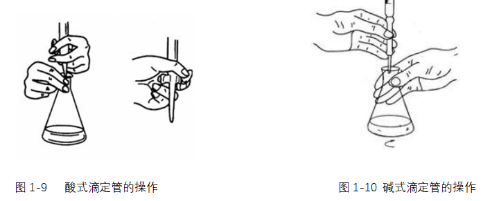 使用酸式滴定管时,其手部的动作应该称为“反扣法”,将活塞套的旋塞部分冲外,用左手控制滴定管的旋塞,大拇指在前,食指及中指在后握住旋塞,无名指和小拇指弯曲靠在尖嘴上。在凡士林涂抹合适的情况下转动活塞时,稍微向手心使劲,这是为了防止滴定过程中旋塞从旋塞套中脱落,并注意手掌不要顶住旋塞,在滴定过程中左手不能离开旋塞(图1-9)。
