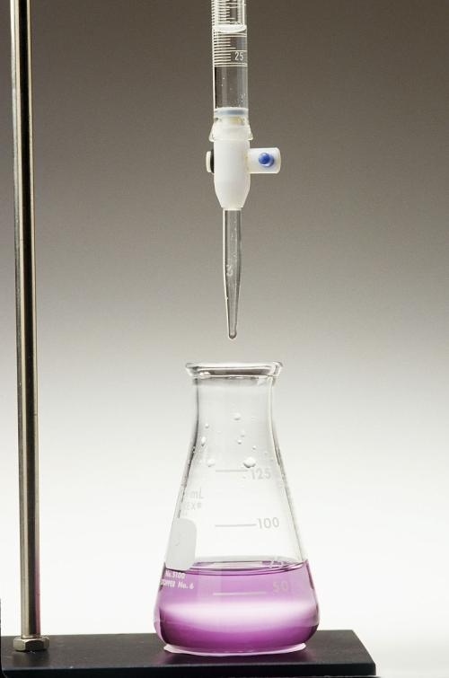 滴定速度将直接影响滴定终点的观察和判断,一般情况下,滴定开始时,滴定速度可适当地快一点(视具体滴定不同有差异),其滴定的快慢程度可以用“见滴成线”来说明,但不能使滴定剂成液流线型流出。滴定时,仔细观察滴定剂滴入点周围的颜色变化,若颜色变化越来越慢则必须放慢滴定速度,需逐滴地滴加滴定剂,滴一滴,摇一摇,直至一滴溶液加入后振摇几下后颜色才变化回去,此时应半滴半滴地滴加,当溶液颜色有明显变化且半分钟内不褪时,即告到达终点,停止滴定。