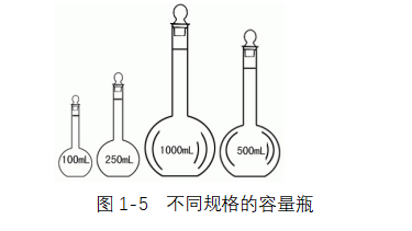 容量瓶是一种细颈梨形的平底玻璃瓶,常带有磨口塞或塑料塞。颈上有标线,瓶上标有容积、温度、In等字样,表示容量瓶是量入式容量分析仪器,在标明温度下,当溶液凹液面下沿与标线相切时,溶液体积与标示体积相等。容量瓶一般用来配制标准溶液、试样溶液和定量稀释溶液。常用的容量瓶有5mL、10mL、25mL、50mL、100mL、250mL、500mL等规格(图1-5)。