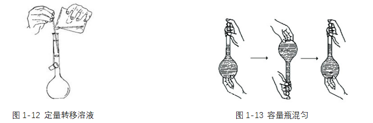 容量瓶使用前应先洗净。若用固体配制溶液,先将准确称量的固体物质在烧杯中溶解,然后再将溶液转移到容量瓶中,转移时,一手(常为右手)拿玻棒,将其伸入容量瓶口,一端轻靠瓶口内壁并倾斜;另一手拿烧杯,使烧杯嘴紧贴玻棒,慢慢倾斜烧杯,使溶液沿玻棒流下,溶液全部流完后,将烧杯轻轻沿玻棒上提,同时将烧杯直立,使附着在玻棒与烧杯嘴之间的溶液流回烧杯或沿玻棒下流(图1-12)。注意不能直接将烧杯从玻棒处拿开,否则,残留在玻棒和烧杯嘴中间的液滴可能损失。然后用去离子水洗涤烧杯3~4次,每次洗涤液一并转入容量瓶中。当至容量瓶容积的2/3时,摇动容量瓶使溶液混匀,此时不能盖上瓶塞将容量瓶倒转。继续加去离子水至接近标线1-2cm时等待1-2min,使瓶颈内壁的溶液流下。用滴管或洗瓶慢慢滴加,直至溶液的弯月面与标线相切为止。最后,盖上瓶塞,左手握住瓶颈,左手食指按住瓶塞,右手托住瓶底,反复倒转并摇动(图1-13)。容量瓶直立后,可以发现此时溶液凹液面在标线以下,属正常现象,是溶液渗入磨口与瓶塞缝隙中引起的,不必再加水至刻线。