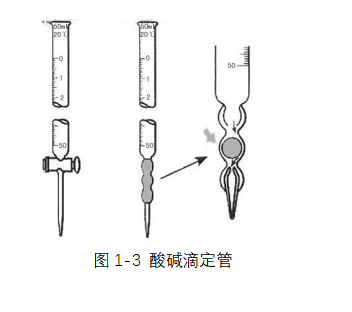 滴定管有酸式滴定管和碱式滴定管两种。酸式滴定管下端有玻璃旋塞,用于装酸性溶液和氧化性溶液,不宜装碱性溶液(为什么?)。碱式滴定管下端连接一段乳胶管,管内有一粒大小合适的玻璃珠,以控制溶液的流出,遇长时间不用碱式滴定管会导致乳胶管老化,弹性下降,需及时更换乳胶管,乳胶管下端连接一尖嘴玻璃管。碱式滴定管只能装碱性溶液,不能装酸性或氧化性溶液,以免乳胶管被腐蚀。