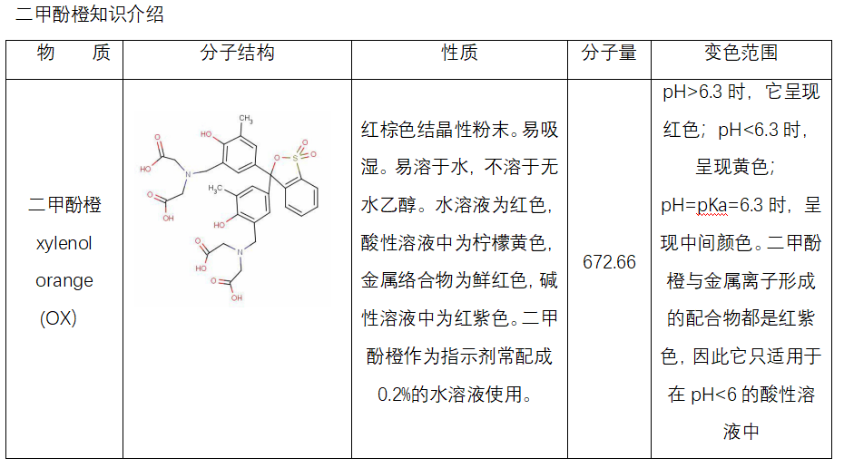 pH>6.3时,它呈现红色;pH<6.3时,呈现黄色;pH=pKa=6.3时,呈现中间颜色。二甲酚橙与金属离子形成的配合物都是红紫色,因此它只适用于在pH<6的酸性溶液中