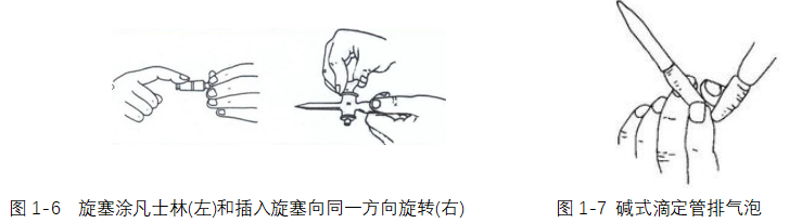 涂凡士林是酸式滴定管使用过程中一项重要而基本的操作,先将旋塞套头上的橡皮套取下,将滴定管的旋塞拔出,用滤纸将旋塞和旋塞槽内的凡士林全部擦干净,然后手指蘸取少许凡士林涂于旋塞孔的两侧(图1-6左),并使其成为一均匀的薄层,注意在靠近旋塞孔位置的中间一圈不涂凡士林,以免凡士林堵塞旋塞孔,将涂好凡士林的旋塞按照与滴定管平行方向插入旋塞套中,按紧,然后向同一方向连续旋转旋塞(图1-6右),直至旋塞上的凡士林成均匀透明的膜。若凡士林涂得不够,会出现旋塞转动不灵活或者明显看到旋塞套上出现纹路;若凡士林涂得太多,则会有凡士林从旋塞槽两侧挤出的现象。若出现上述情况,都必须将旋塞和旋塞槽擦拭干净后重新涂凡士林。凡士林涂抹完成后为防止滴定过程中旋塞从旋塞套上脱落的现象,必须在旋塞套的小头部分套上一个小橡皮套,在套橡皮套时,要用手指顶住旋塞柄,以防旋塞松动。整个操作进行完后还要重新检查滴定管的漏水情况。