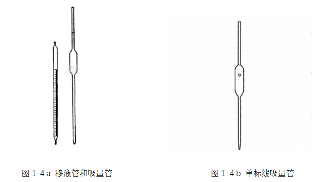 移液管和吸量管是用于准确移取一定体积液体的量出式容量分析仪器,如图1-4所示。移液管中间部分膨大,管颈上部有一环形刻线,膨大部分标有容积、温度、Ex、“快”或“吹”等字样,俗称大肚移液管,正规名称为“单标线吸量管”。常用的移液管有5mL、10mL、25mL、50mL等规格。其精密度一般高于“分刻度吸量管”。